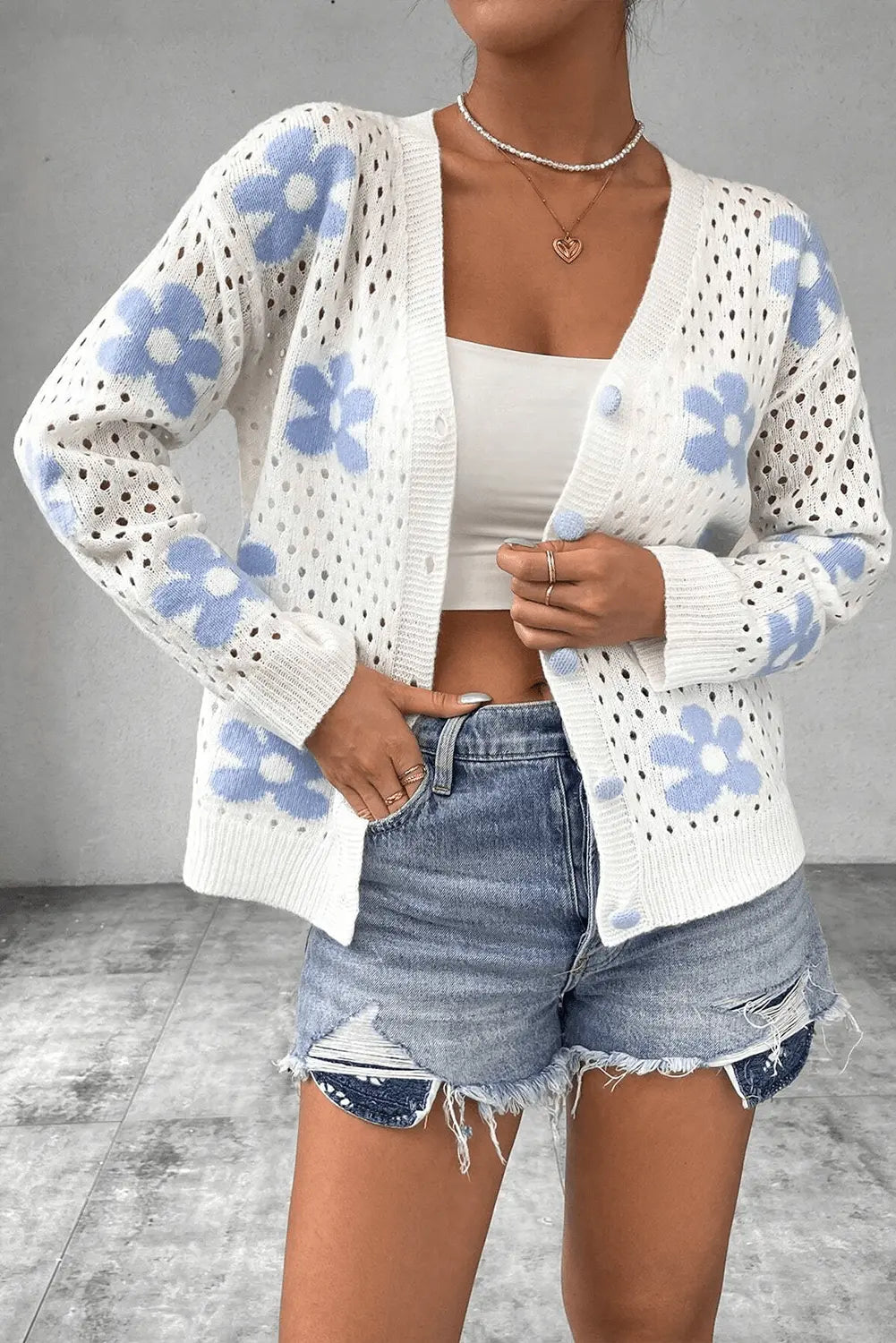 - Kenmerken: Bloemenpatroon, knoopsluiting, losse pasvorm, licht gebreid ontwerp